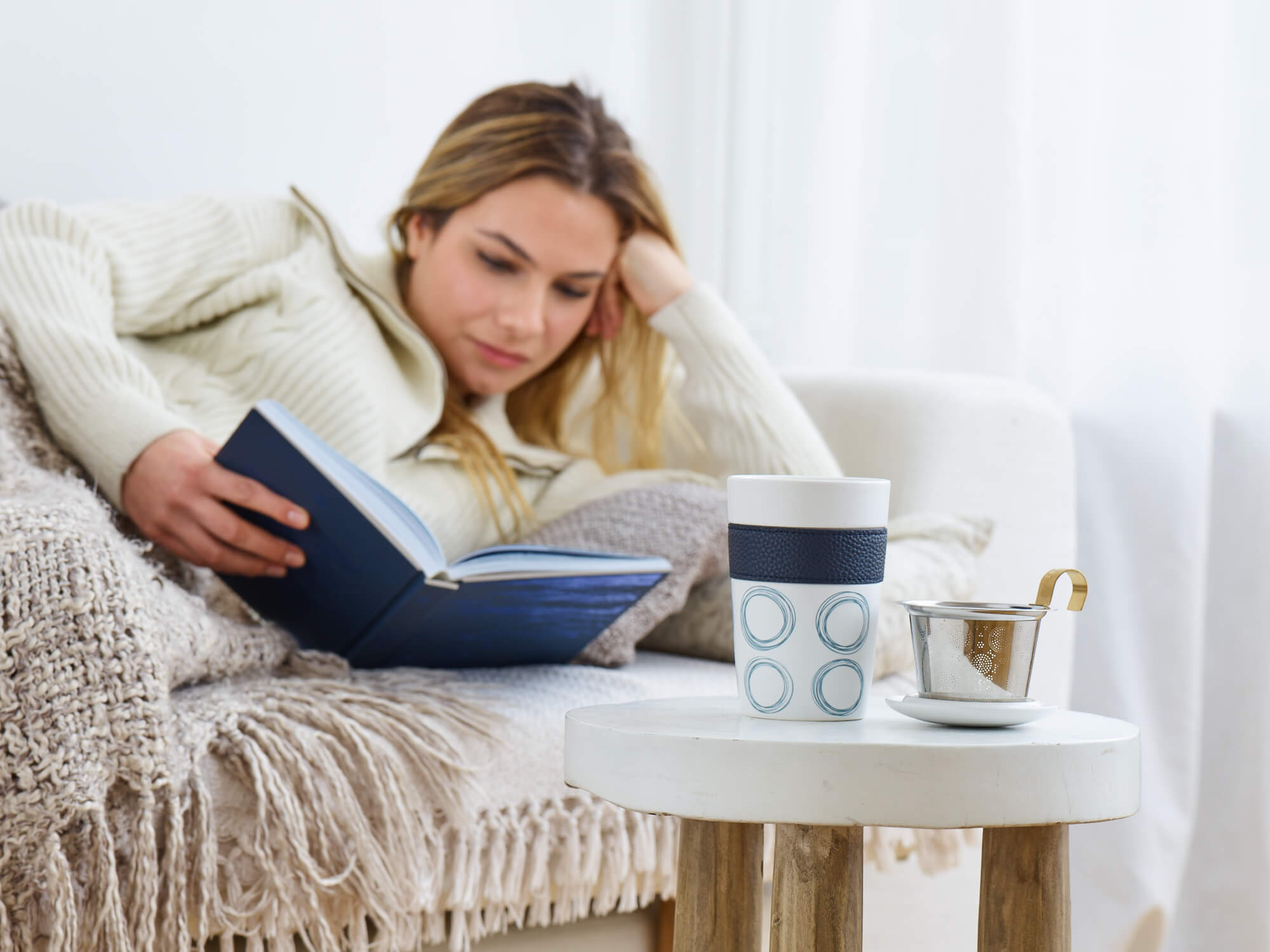 Dieser doppelwandige Teebecher mit dem Motiv "Circular-Blue" ist aus feinem Porzellan und hat nicht nur einen verzierten Porzellandeckel, sondern auch noch ein großes Edelstahl-Teesieb mit griffigem Henkel.