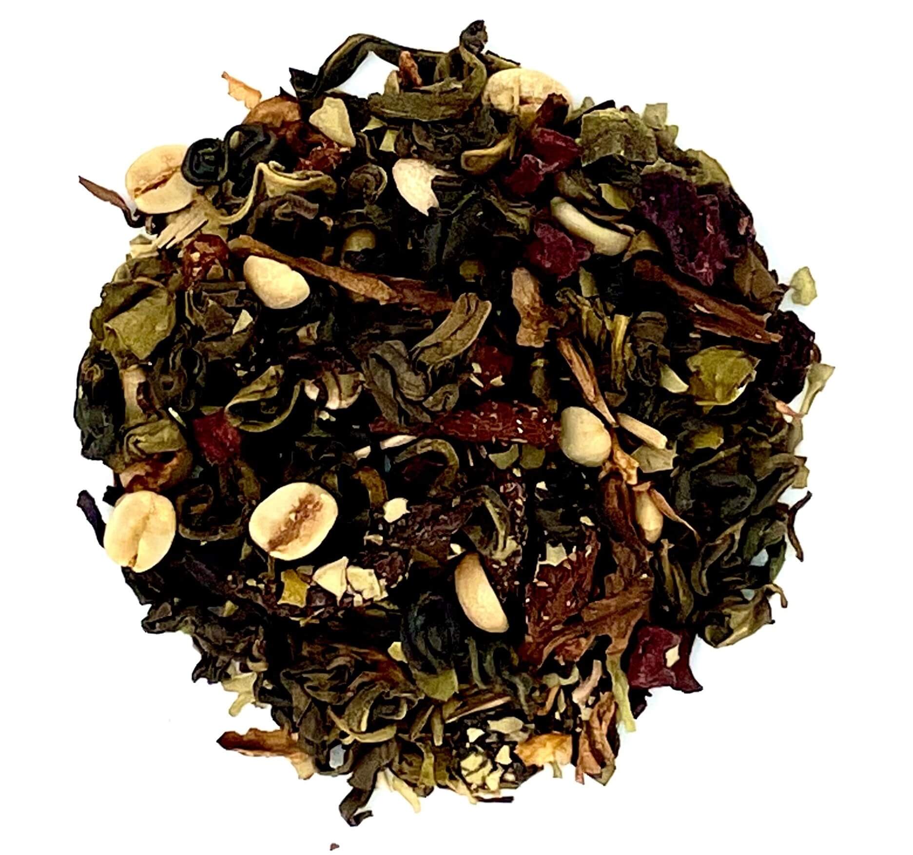 Diese Früchtemischung überzeugt mit ihrem zartfruchtigen Acai-Gojibeer-Geschmack. Zutaten: Grüner Tee, grüne Kaffeebohnen, Gojibeeren (15 %) (enthalten Schwefeldioxid), Mate, Aroma, Acaistücke (5 %) (Acai, Apfel, Apfelsaftkonzentrat, Säuerungsmittel: Zitronensäure,Reismehl), weißer Hibiskus, Rote-Bete-Stücke.