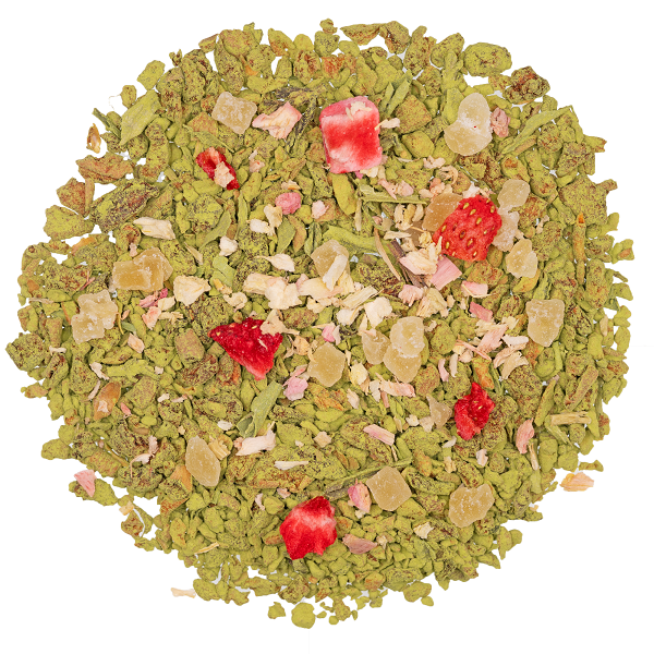 Zutaten: Apfelstücke (Apfel, Säuerungsmittel: Citronensäure), kandierte Ananasstücke (Ananas, Zucker), Grüner Tee Japan Matcha (5%), natürliches Aroma, Süßkraut, Erdbeerstücke (0,5%), Rhabarberstücke