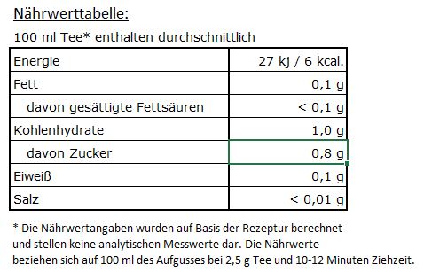 Zutaten: Apfelstücke, Hagebuttenschalen, Hibiskusblüten, Brombeerblätter süß, Aroma, Zimtstücke, Sahne-Karamellstücke (gezuckerte Kondensmagermilch, Zucker, Glukosesirup, Butterfett, Feuchthaltemittel: Sorbit, Emulgator: Mono- und Diglyceride von Speisefettsäuren), Popcorn, römische Kamille, gefr.-getr. Cranberryscheiben.