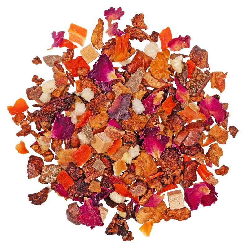Zutaten: Apfelstücke (Apfel, Säuerungsmittel: Citronensäure), Karottenstücke, Birnenstücke (9%), Aroma, Mönchsfrucht-Dekokt, Zimtrinde, Karamellstücke (Magerkondensmilch gezuckert, Zucker, Glukosesirup, Butterfett, Feuchthaltemittel: Sorbitsirup, Emulgator: Mono- und Diglyceride von Speisefettsäuren) (3%), Rosenblütenblätter.