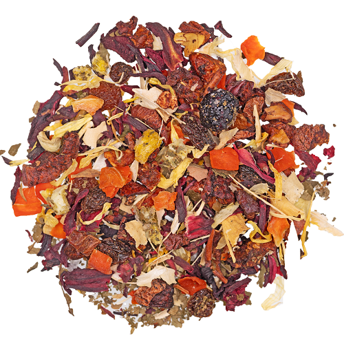 Zutaten: Apfelstücke (Apfel, Säuerungsmittel: Citronensäure), Weinbeeren, Karottenflakes, Hibiskusblüten, Rote Beete Stücke, natürliches Aroma, Brombeerblätter, Bohnenschalen, Zitronenschalen, Heidelbeeren (0,5%), Ringelblumenblüten, Yuzustücke