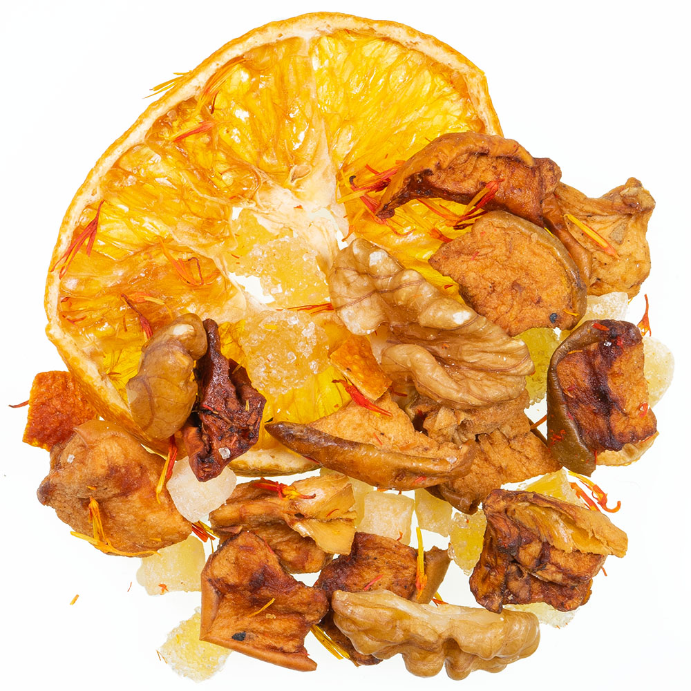 Dieser Früchtetee mit leckerem Apfel-Mandarinen-Geschmack erinnert an die drei klassischen Gaben des Nikolaus: Äpfel, Mandarinen und Nüsse.