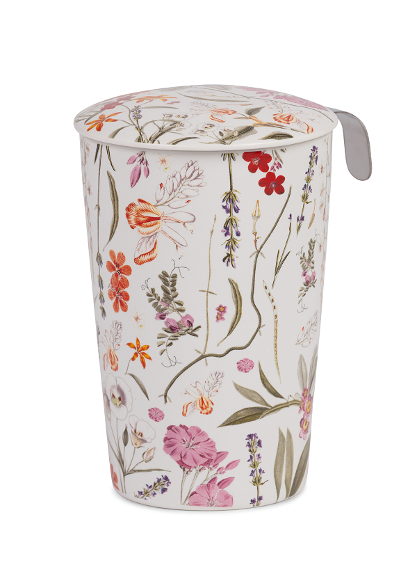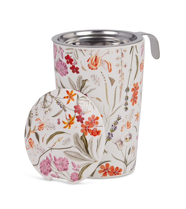 Der doppelwandige, frühlingsfrische Teebecher mit dem Motiv "Mira" ist aus feinem Porzellan und hat nicht nur einen reichhaltig verzierten Porzellandeckel, sondern auch ein großes Teesieb.