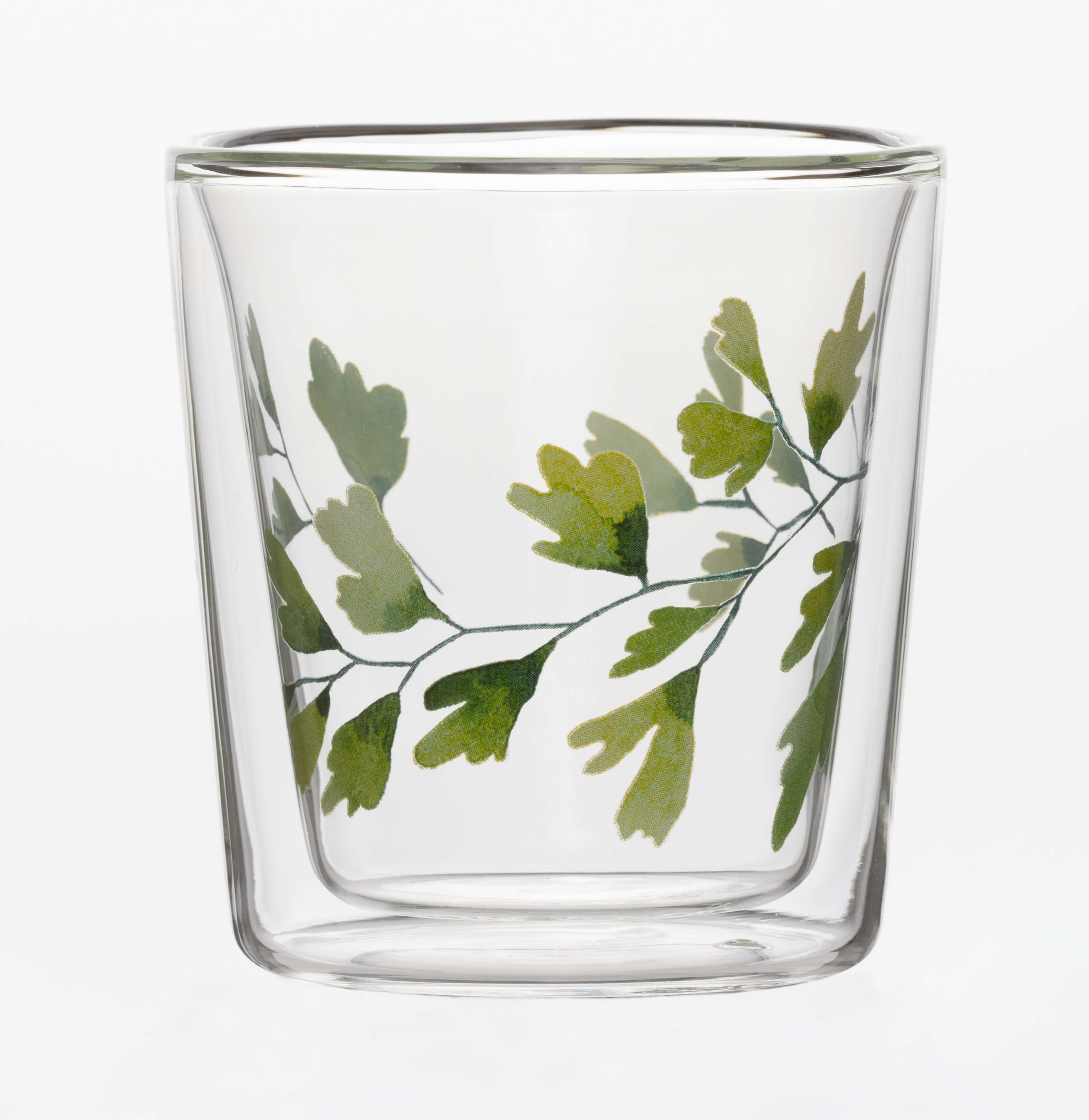 Das Teeglas LYN "Gingko" hat ein Fassungsvermögen von ca. 250ml, ist 9 cm hoch und hat am oberen Rand einen Durchmesser von 8,5 cm.