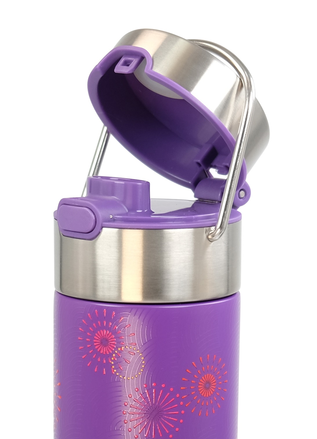 Hergestellt aus doppelwandigem Edelstahl, verfügt die Trinkflasche über einen praktischen Trinkdeckel mit stabilem Tragegriff.