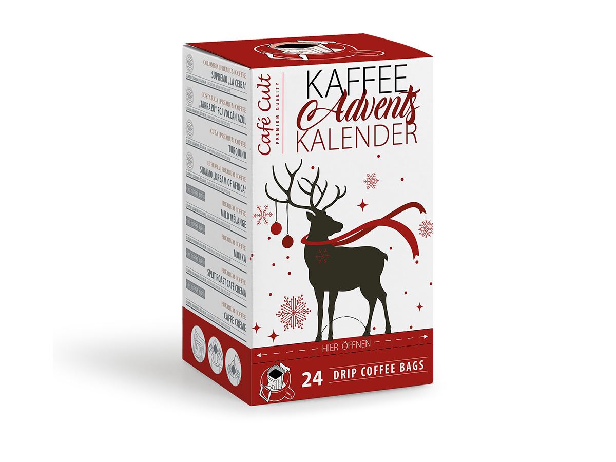 Jeder Kalender ist gefüllt mit 24 einzeln verpackten Drip Coffee Bags mit insgesamt 12 ausgewählten Kaffeespezialitäten aus unseren Sortimenten Single Origin Coffee, Fine Coffee Blend und Flavoured Coffee.